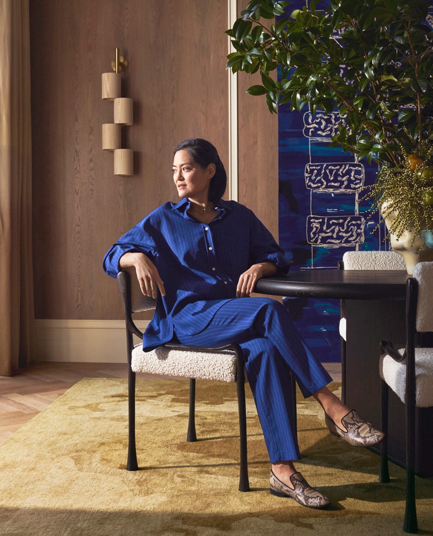 Joyce Wang in the apartment she created for the ‘Designer Collection’. She is seated on a De La Vega dining chair. The rug is from CC Tapis and the wall light is by Allied Maker