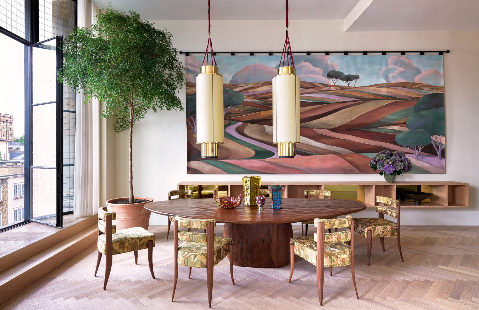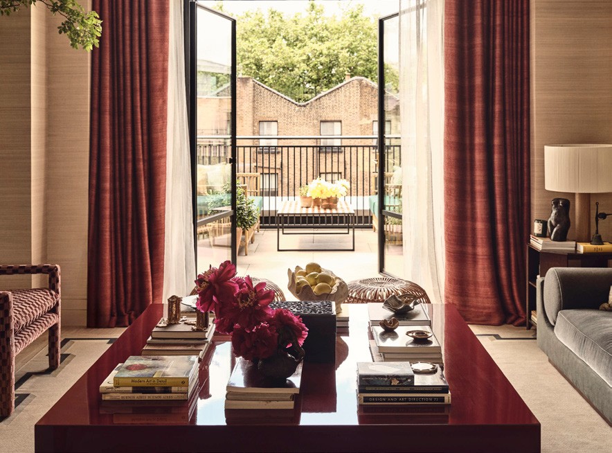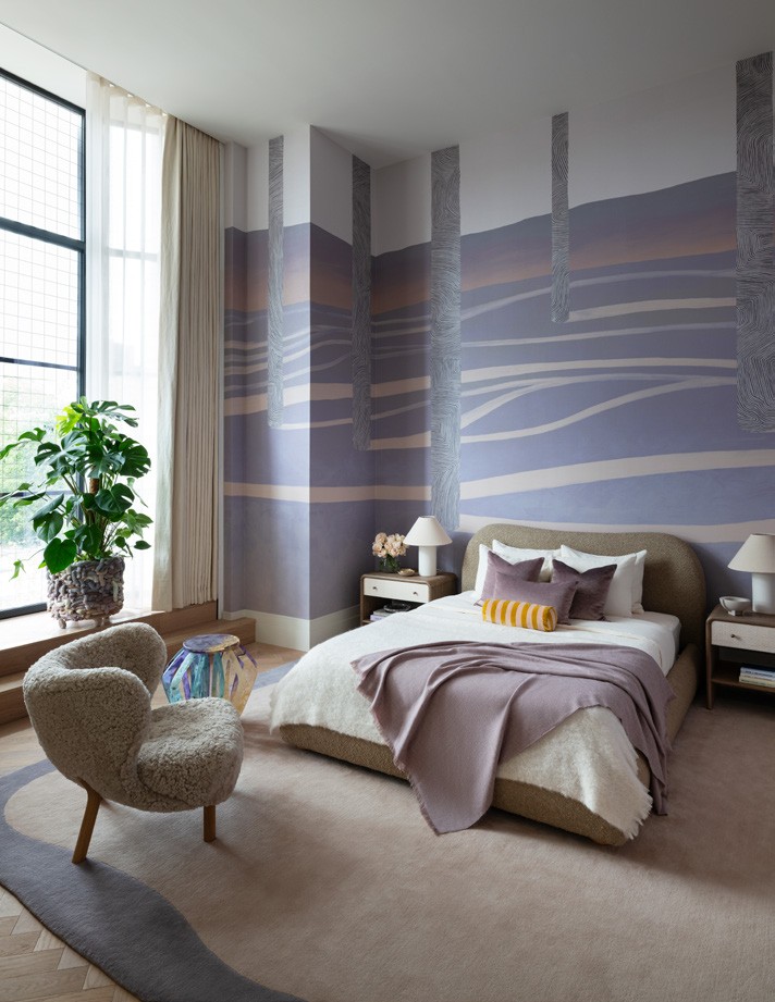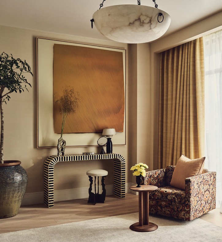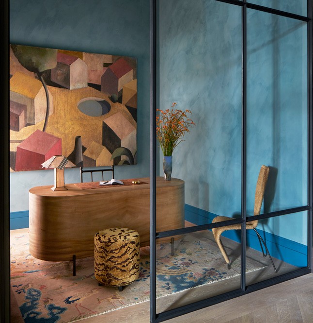 Art underpins all of Behun’s projects, but in this case, she wasn’t responding to a client’s collection, but rather building it into the design from scratch. She used a local company to source work by British and European artists, procured pieces from the US and commissioned a set designer to paint the artwork over the dining table. ‘That layer was really important,’ she says. On a sunny day, the original windows’ square mullions cast striking shadows, and even when it’s overcast, the rooms are suffused with light. ‘No matter where I am, I’m thinking about the light, the views and which palette feels most harmonious with that, so your eye doesn’t feel like it’s stopping abruptly,’ she says. As a result, her palette has depth but isn’t super-saturated. There’s a ‘slightly sun-faded quality’ to the tones, she explains, ‘because the apartment has this lovely golden colour, almost like a late-afternoon sun. In certain rooms, we punched that up a bit – there’s a beautiful space down the hallway that doesn’t get natural light, so we played with this deep, almost-denim blue.’