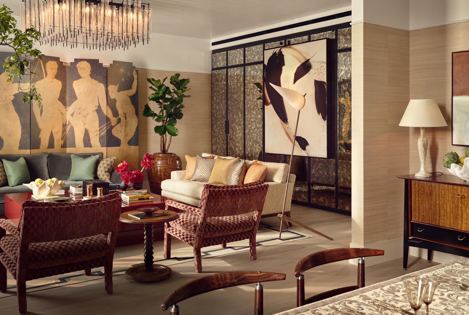 From left Doors framed by mohair curtains by Coral Stephens lead onto one of the balconies with a lacquer coffee table by Treeslounge in the foreground; The living and dining room with a hand-painted screen by Gergei Erdei, Milo Baughman armchairs and a Sogni di Cristallo chandelier; a bed with a Ben Whistler headboard and bespoke chaise by Linda Boronkay Design Studio. Behind the bed is a tapestry that Linda commissioned from Nest Design; a seating area with a Walter Knoll armchair reupholstered in Watts of Westminster fabric, vintage sideboard and Jay Achilles side table