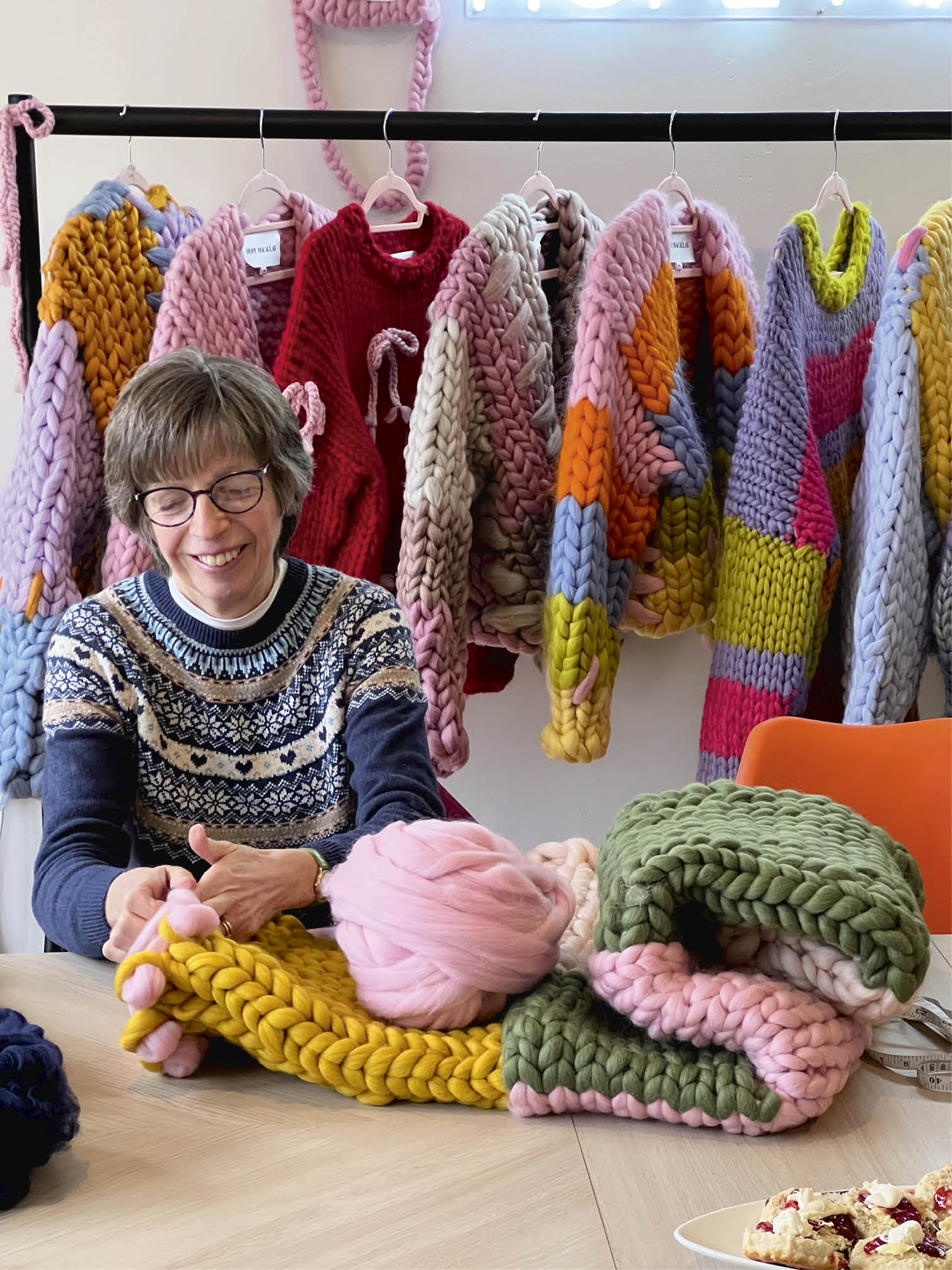 Here, she talks to Imogen Cooper about her team of crafty local women and the inspiration behind her colourful designs – and what it’s like to employ her mum as a knitting delivery driver.