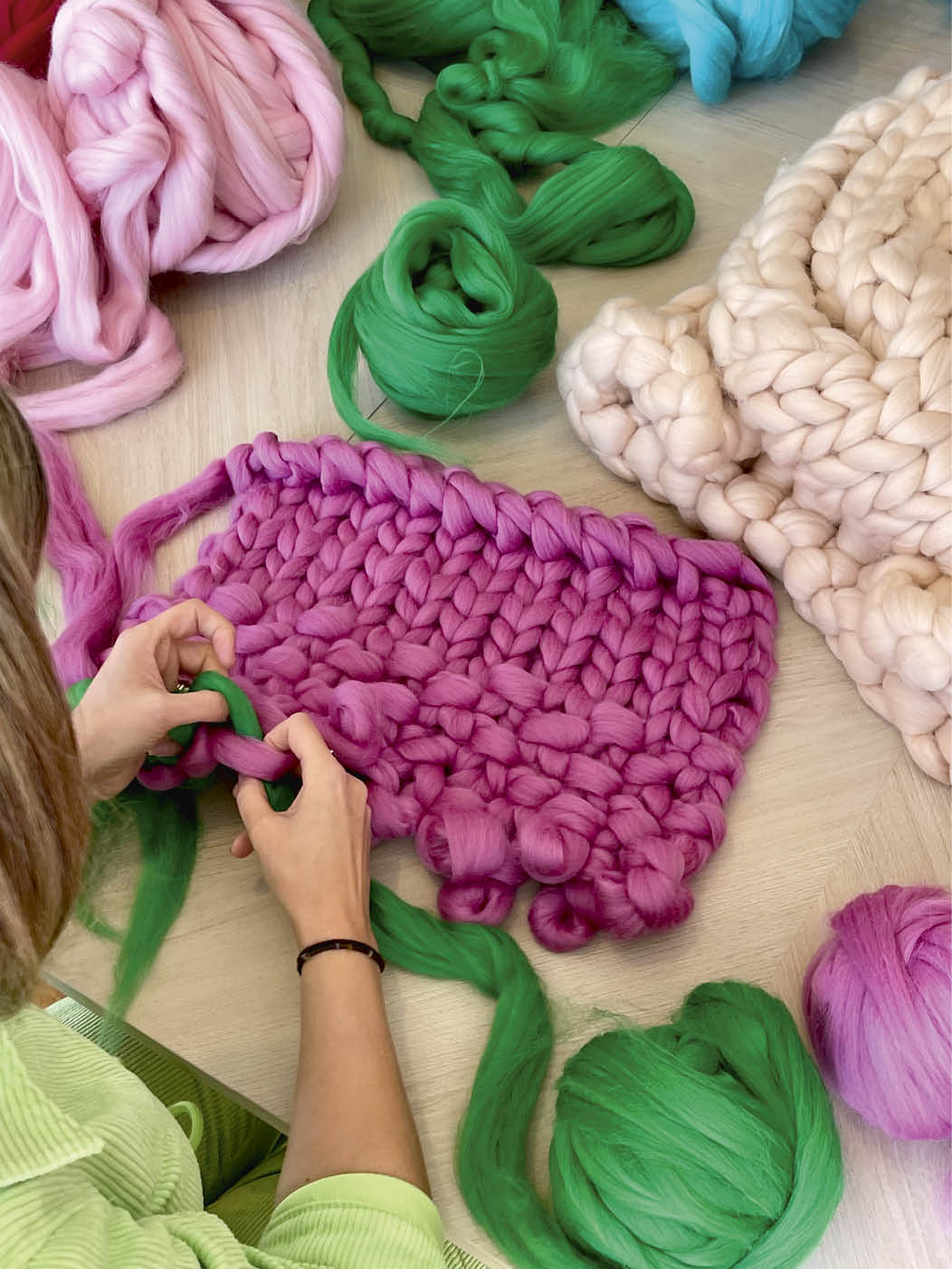 Have you always loved knitting? Yes, my granny taught me how to knit with needles when I was four. Then, when I went to university, I was pushed to be creative. I loved the weight of super-chunky wool and it easier to knit with my hands than needles. I developed that technique in jacket form and taught all my knitters how to do it.