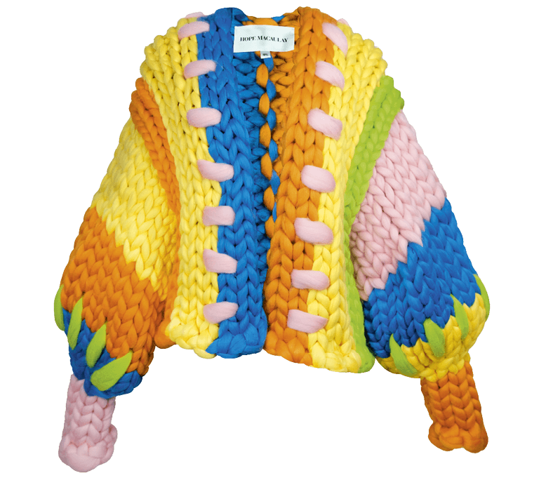 How did you start Hope Macaulay? I went to the University for the Creative Arts in Rochester in Kent and studied fashion textiles. For my final collection, I used beading and printing in my pieces, as well as creating knitwear. But at Graduate Fashion Week, everyone was talking about the knitwear. So I decided that’s what I’d focus on. I came home to Northern Ireland and started my brand. I worked in a supermarket at the same time, and then it all took off in 2020, so now I get to run my own business full-time.