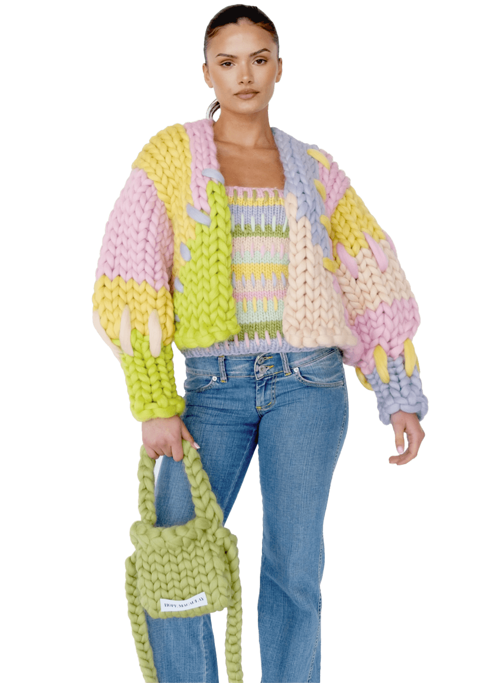 Tell me about your brand. We’re a knitwear company – everything we sell is handmade in Northern Ireland. Our colourful, chunky colossal knits are what we’re most known for. Our clothes are handmade by a group of 20 knitters. It’s a family business – my mum is our knitter co-ordinator, so she drives around Northern Ireland to all the knitters, collecting their pieces each week.